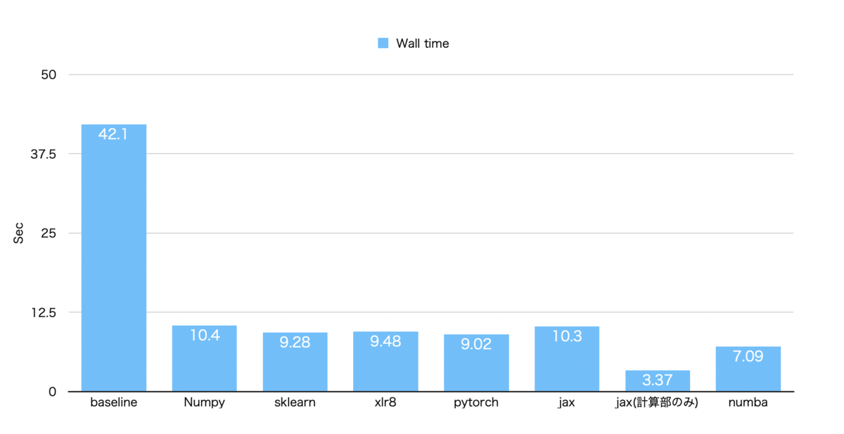 という結果になりました。 numpyだけを使用してもそこそこ高速ではある点はちょっと意外でした。