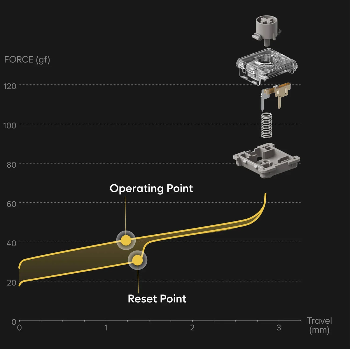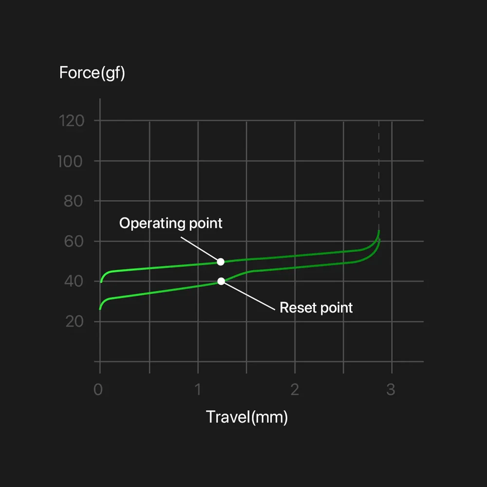 リニア軸でOperating Pointが大体40gのスイッチって感じですね。 HHKBが確か40gだった気がするので、押下圧的にはそんなもんです。 実際に使ってみた感想としては結構打鍵感は軽い感じがします。 もちろんロープロファイルなのでストロークが違うというのはありますが、かなり軽快に打鍵できる印象でした。 底打ち音はあまり大きくなく優しく反発してくれている印象で、打鍵音自体は非常に静かに感じました。