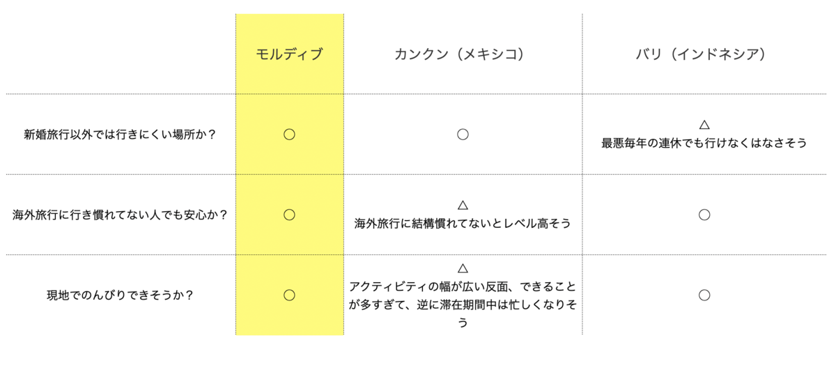 という理由で外しました。 結果的に「モルディブがいいんじゃない?」ということになりました。